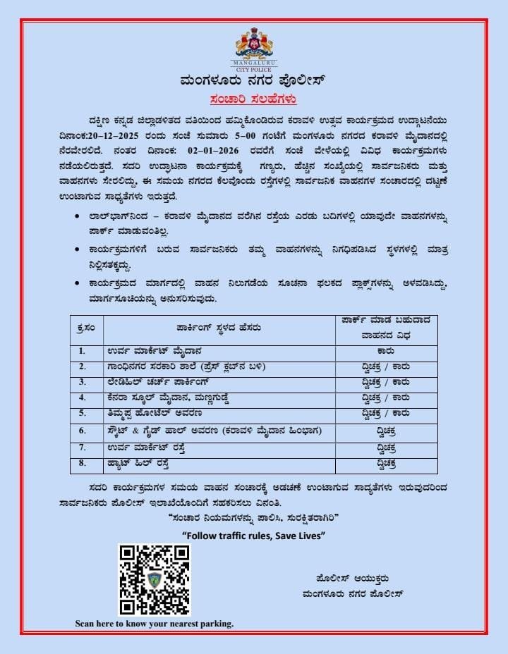 ಮಂಗಳೂರಿನಲ್ಲಿ ಕರಾವಳಿ ಉತ್ಸವ; ಪೊಲೀಸರಿಂದ ಸಂಚಾರಿ ಸಲಹೆಗಳು ಜಾರಿ