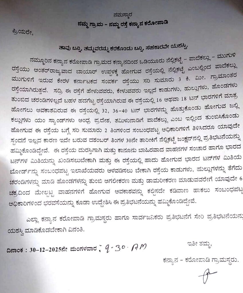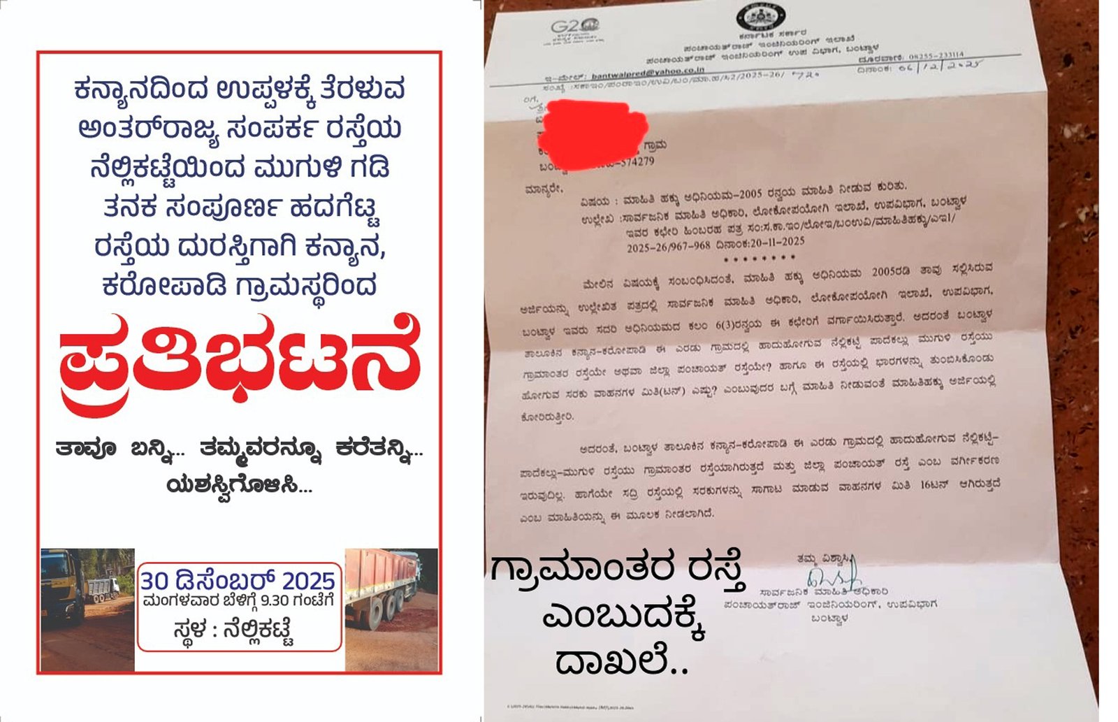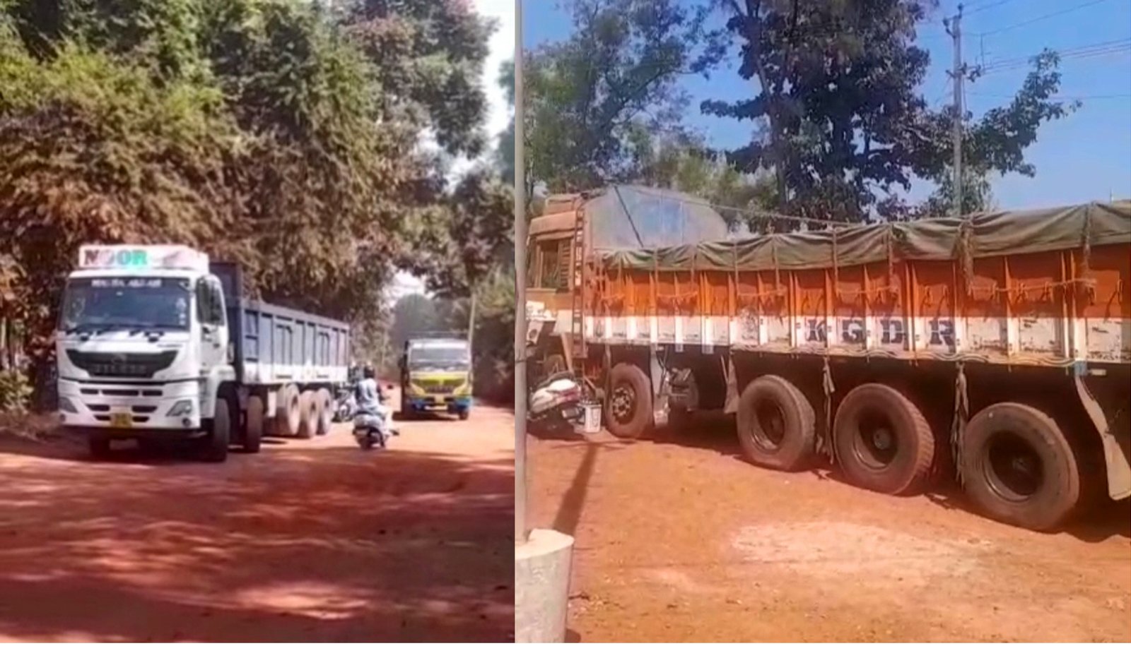 ಬಾಕ್ಸೈಟ್ ಲಾರಿಗಳ ಅಟ್ಟಹಾಸ.ಎಕ್ಕುಟ್ಟಿ ಹೋದ ರಸ್ತೆಗಳು.. ಕನ್ಯಾನ-ನೆಲ್ಲಿಕಟ್ಟೆ-ಮುಗುಳಿ ಅಂತರ್ರಾಜ್ಯ ಸಂಪರ್ಕ ರಸ್ತೆ ದುರಸ್ತಿಗೆ ನಾಗರಿಕರ ಪ್ರತಿಭಟನೆ
