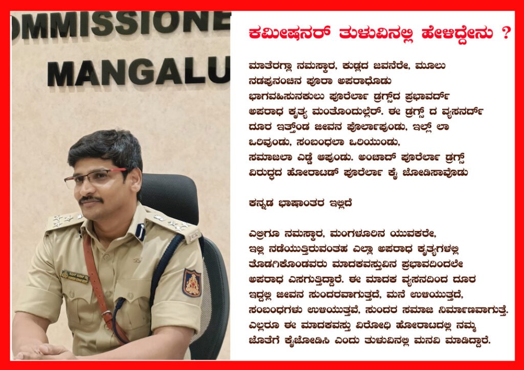 ಸುಧೀರ್ ಕುಮಾರ್ ರೆಡ್ಡಿ ಮಂಗಳೂರು ಕಮಿಷನರ್ ಆಗಿ ಅಧಿಕಾರ ಸ್ವೀಕರಿಸಿಕೊಂಡ ಬಳಿಕ ಮಾದಕ ವಸ್ತುಗಳ ಸಾಗಾಟ ಮತ್ತು ಮಾರಾಟದ ವಿರುದ್ಧ ಹಲವು ಕಠಿಣ ಕ್ರಮಗಳನ್ನು ಕೈಗೊಳ್ಳುವ ಮೂಲಕವೂ ಗುರುತಿಸಿಕೊಂಡಿದ್ದಾರೆ. ಯಾವುದೇ ಕಾಲೇಜು ಕ್ಯಾಂಪಸ್ ಗಳಲ್ಲೂ ಮಾದಕ ವಸ್ತುಗಳು ಪೂರೈಕೆಯಾಗದ ನಿಟ್ಟಿನಲ್ಲಿ ಕ್ರಮ ಕೈಗೊಂಡಿದ್ದಾರೆ. ಡ್ರಗ್ಗ್ ಪೆಡ್ಲರ್‌ಗಳ ಹೆಡೆಮುರಿಕಟ್ಟುವ ಮೂಲಕ ಡ್ರಗ್ಗ್ ಸಾಗಾಣಿಕೆಗೆ ಕಡಿವಾಣ ಹಾಕಿದ್ದಾರೆ.ಕರಾವಳಿಯಲ್ಲಿ ನಡೆಯುತ್ತಿರುವ ಕೊಲೆ, ಸುಲಿಗೆ, ಕಳ್ಳತನ ದೊಂಬಿ ಯಾವುದೇ ಅಪರಾಧಿಕ ಕೃತ್ಯಗಳಿಗೆ ಮಾದಕ ಸೇವನೆಯೇ ಪ್ರಮುಖ ಕಾರಣವೆಂದು ಕಂಡುಕೊAಡ ಆಧಿಕಾರಿಗಳು ಆ ಜಾಲದ ಹಿಂದೆ ಬಿದ್ದಿದ್ದಾರೆ. ಪ್ರಮುಖ ಕುಳಗಳ ಅಡ್ಡೆಯನ್ನು, ಸಾಗಿ ಬರುವ ದಾರಿಯನ್ನೂ ಪತ್ತೆಹಚ್ಚಿ ವ್ಯಸನಕ್ಕೆ ಬಲಿ ಬೀಳುವ ಯುವಜನತೆಗೆ ದೈರ್ಯ ಮತ್ತು ಸಂದೇಶದ ಮೂಲಕ ಜಾಗೃತಿಯನ್ನು ನೀಡುತ್ತಲೇ ಇದ್ದಾರೆ. ಕೆಲವು ದಿನಗಳ ಹಿಂದೆ ಕಮಿಷನರ್ ಅವರು ವ್ಯಸನ ವಿರೋಧಿ ಜಾಗೃತಿ ಸಂದೇಶವನ್ನು ಕನ್ನಡದಲ್ಲಿ ಮಾಡದೆ ತುಳು ಭಾಷೆಯಲ್ಲಿ ನೀಡುವುದರ ಮೂಲಕ ತುಳುವರ ಮನಸ್ಸನ್ನು ಮುಟ್ಟುವ ಉತ್ತಮವಾದ ಕೆಲಸ ಮಾಡಿ ಅದರಿಂದ ಉತ್ತಮವಾದ ನಿರೀಕ್ಷೆಯಲ್ಲಿದ್ದಾರೆ.
