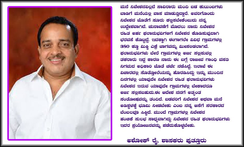 ನಿವೇಶನ ರಹಿತರಿಗೆ ಯಾವುದೇ ಗ್ರಾಮದಲ್ಲಿಯೂ ಅರ್ಜಿ ಸಲ್ಲಿಸಬಹುದು; ರಾಜೀವ ಗಾಂಧಿ ವಸತಿ ನಿಗಮದಿಂದ ಸುತ್ತೋಲೆ; ಪುತ್ತೂರು ಶಾಸಕ ಅಶೋಕ್ ರೈ ನಿವೇಶನ ಹಂಚಿಕೆ ಕಾರ್ಯಕ್ಕೆ ಸರಕಾರದಿಂದ ಪೂರ್ಣ ಬೆಂಬಲ