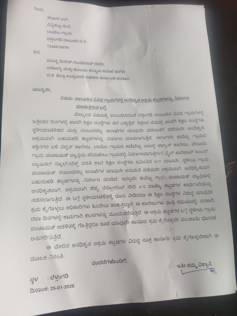 ಬೆಳ್ತಂಗಡಿ ತಾಲೂಕಿನಾದ್ಯಂತ ಅನಧಿಕೃತ ಬಹುಮಹಡಿ ಕಟ್ಟಡಗಳ ನಿರ್ಮಾಣ..ಕಾನೂನು ಕ್ರಮ ಕೈಗೊಳ್ಳಬೇಕಾದ ಅಧಿಕಾರಿಗಳ ಜಾಣ ಕುರುಡು..ಉಸ್ತುವಾರಿ ಸಚಿವರಿಗೆ ದೂರು ನೀಡಿದ ಸಾಮಾಜಿಕ ಕಾರ್ಯಕರ್ತ ಶೇಖರ್ ಲಾಯಿಲ.