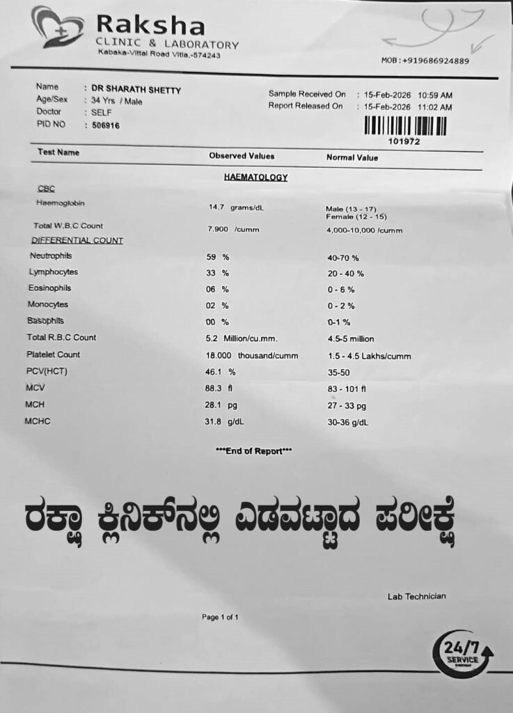ಸ್ವತಃ ವೈದ್ಯರಾಗಿದ್ದಾರೂ ಡಾ.ಶರತ್ ಅವರು ರಕ್ತ ಪರೀಕ್ಷಾ ವರದಿಯಿಂದ ಬೆಚ್ಚಿ ಬಿದ್ದಿದ್ದಾರೆ. ತಕ್ಷಣವೇ ವಿಟ್ಲದಲ್ಲಿರುವ ಧನ್ವಂತರಿ ಕ್ಲಿನಿಕಲ್ ಲ್ಯಾಬೋರೇಟರಿಗೆ ತೆರಳಿ ರಕ್ತ ಪರೀಕ್ಷೆ ಮಾಡಿಸಿದ್ದಾರೆ. ಅಲ್ಲಿನ ವರದಿಯಲ್ಲಿ ಪ್ಲೇಟ್ಲೆಟ್ ಸಂಖ್ಯೆ 1ಲಕ್ಷದ 13ಸಾವಿರ ಎಂದು ದಾಖಲಾಗಿದೆ.
