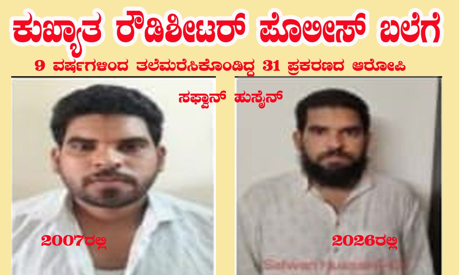 ಕುಖ್ಯಾತ ರೌಡಿಶೀಟರ್ ಸಫ್ವಾನ್ ಹುಸೈನ್ ಸಿಸಿಬಿ ಪೊಲೀಸ್ ಬಲೆಗೆ 31 ಪ್ರಕರಣಗಳಲ್ಲಿ ಭಾಗಿಯಾಗಿ 9 ವರ್ಷಗಳಿಂದ ತಲೆಮರೆಸಿಕೊಂಡಿದ್ದ ಆರೋಪಿ
