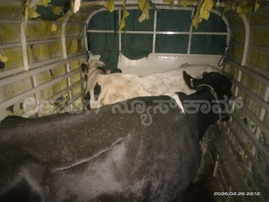 ಆ ಸಂದರ್ಭ ಎರಡು ದನಗಳನ್ನು ಹಿಂಸಾತ್ಮಕವಾಗಿ ತುಂಬಿಸಿ ಎಲ್ಲಿಂದಲೋ ಸಾಗಾಟ ಮಾಡಿಕೊಂಡು ಬಂದಿರುವುದು ಕಂಡುಬಂದಿರುತ್ತದೆ. ಈ ಬಗ್ಗೆ ವಾಹನದಲ್ಲಿದ್ದ ಮಂಡ್ಯ ನಿವಾಸಿಗಳಾದ ಚಾಲಕ ನವೀನ ಹಾಗೂ ಮತ್ತೊರ್ವ ಚೇತನ್ ಎಂಬವರಲ್ಲಿ ವಿಚಾರಿಸಿದ್ದಾರೆ.
