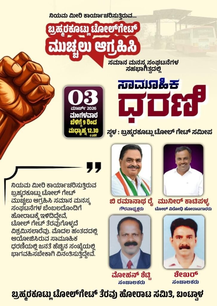 ಬಂಟ್ವಾಳ: ನಿಯಮ ಮೀರಿ ಕಾರ್ಯಾಚರಿಸುತ್ತಿರುವ ಬ್ರಹ್ಮರಕೂಟ್ಲು ಟೋಲ್ ಗೇಟ್ ಅನ್ನು ತಕ್ಷಣವೇ ಮುಚ್ಚಬೇಕೆಂದು ಆಗ್ರಹಿಸಿ ‘ಬ್ರಹ್ಮರಕೂಟ್ಲು ಟೋಲ್ ಗೇಟ್ ತೆರವು ಹೋರಾಟ ಸಮಿತಿ’ ವತಿಯಿಂದ ಬೃಹತ್ ಪ್ರತಿಭಟನೆಯನ್ನು ಹಮ್ಮಿಕೊಳ್ಳಲಾಗಿದೆ. ಸಮಾನ ಮನಸ್ಕ ಸಂಘಟನೆಗಳ ಸಹಭಾಗಿತ್ವದಲ್ಲಿ ಮಾರ್ಚ್ 3, ಮಂಗಳವಾರದಂದು ಬೆಳಿಗ್ಗೆಯಿಂದ ಮಧ್ಯಾಹ್ನದವರೆಗೆ ಸಾಮೂಹಿಕ ಧರಣಿ ನಡೆಯಲಿದೆ.