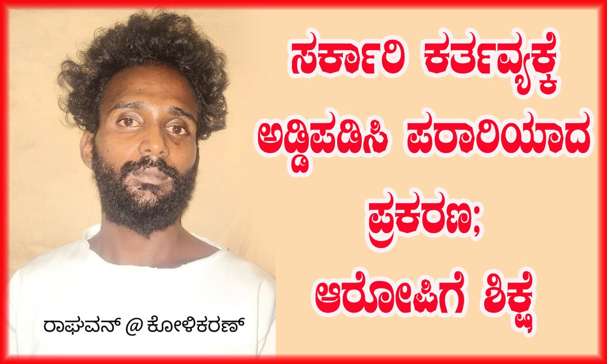 ಸುಳ್ಯ: ಸರಕಾರಿ ಕರ್ತವ್ಯಕ್ಕೆ ಅಡ್ಡಿಪಡಿಸಿದ ಹಾಗೂ ಹಲ್ಲೆ ನಡೆಸಿದ ಪ್ರಕರಣಕ್ಕೆ ಸಂಬಂಧಿಸಿದಂತೆ ದೋಷಿ ರಾಘವನ್ ಅಲಿಯಾಸ್ ಕೋಳಿಕರಣ್ ಎಂಬಾತನಿಗೆ ಸುಳ್ಯದ ನ್ಯಾಯಾಲಯವು ಜೈಲು ಶಿಕ್ಷೆ ಹಾಗೂ ದಂಡ ವಿಧಿಸಿ ತೀರ್ಪು ನೀಡಿದೆ.