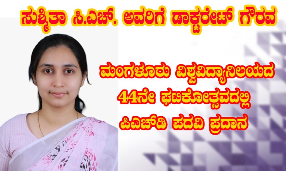 ಮಂಗಳೂರು ವಿಶ್ವವಿದ್ಯಾಲಯದ ಅನ್ವಯಿಕ ಸಸ್ಯಶಾಸ್ತ್ರ ವಿಭಾಗದ ಉಪನ್ಯಾಸಕಿ ಸುಶ್ಮಿತ ಸಿ.ಎಚ್. ಅವರು ಮಂಡಿಸಿದ ಸಂಶೋಧನಾ ಪ್ರಬಂಧಕ್ಕೆ ಮಂಗಳೂರು ವಿಶ್ವವಿದ್ಯಾಲಯವು ಪಿಎಚ್.ಡಿ ಪದವಿ ನೀಡಿ ಗೌರವಿಸಿದೆ. ಅವರು ವಿಶ್ವವಿದ್ಯಾಲಯದ ಅನ್ವಯಿಕ ಸಸ್ಯಶಾಸ್ತ್ರ ವಿಭಾಗದ ಪ್ರಾಧ್ಯಾಪಕರಾದ ಡಾ. ಕೃಷ್ಣಕುಮಾರ್...