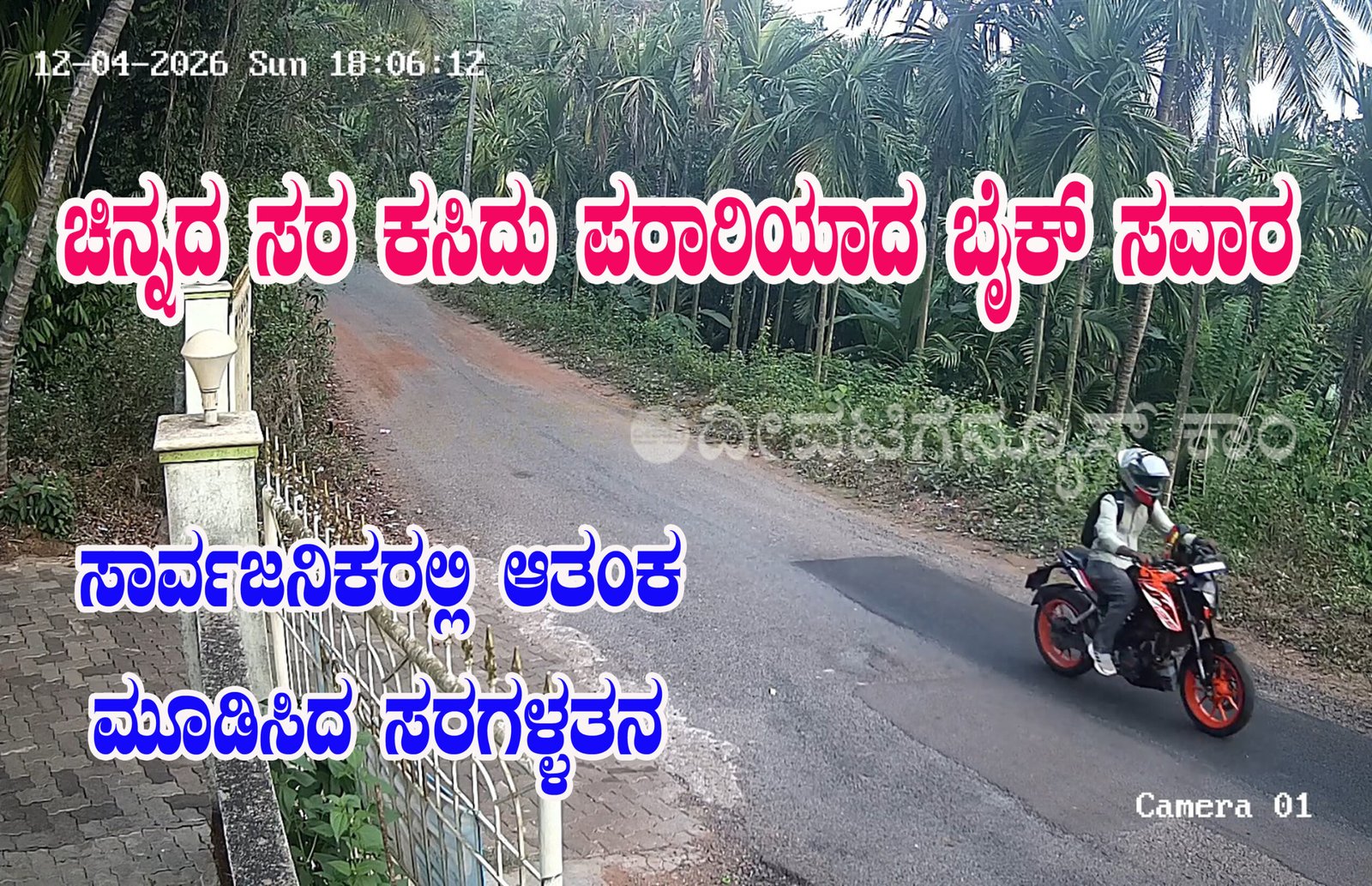 ಕೋಡಪದವು ಮದಕದ ನಿವಾಸಿಯೊಬ್ಬರ ಮಗು ಮನೆಯ ಮುಂಭಾಗ ಆಟವಾಡುತ್ತಿದ್ದಾಗ, ಕೆಟಿಎಂ (KTM) ಬೈಕಿನಲ್ಲಿ ಬಂದ ವ್ಯಕ್ತಿಯೋರ್ವ ಅತಿ ವೇಗವಾಗಿ ಬಂದು ಮಗುವಿನ ಸರವನ್ನು ಕಿತ್ತುಕೊಂಡು ಸ್ಥಳದಿಂದ ಪರಾರಿಯಾಗಿದ್ದಾನೆ. ಈ ಕೃತ್ಯದ ದೃಶ್ಯವು ಸಮೀಪದ ಪಂಚಮಿ ಸೂಪರ್ ಮಾರ್ಕೆಟ್ನ ಸಿಸಿ ಕ್ಯಾಮೆರಾದಲ್ಲಿ ಸೆರೆಯಾಗಿದೆ. ಕಪ್ಪು ಮತ್ತು ಕಿತ್ತಳೆ ಬಣ್ಣದ ಕೆಟಿಎಂ ಬೈಕಿನಲ್ಲಿ ಸವಾರನು ಹೆಲ್ಮೆಟ್ ಧರಿಸಿ ವೇಗವಾಗಿ ಚಲಿಸುತ್ತಿರುವುದು ಸಿಸಿಟಿವಿ ದೃಶ್ಯಾವಳಿಯಲ್ಲಿ ಕಂಡುಬಂದಿದೆ.