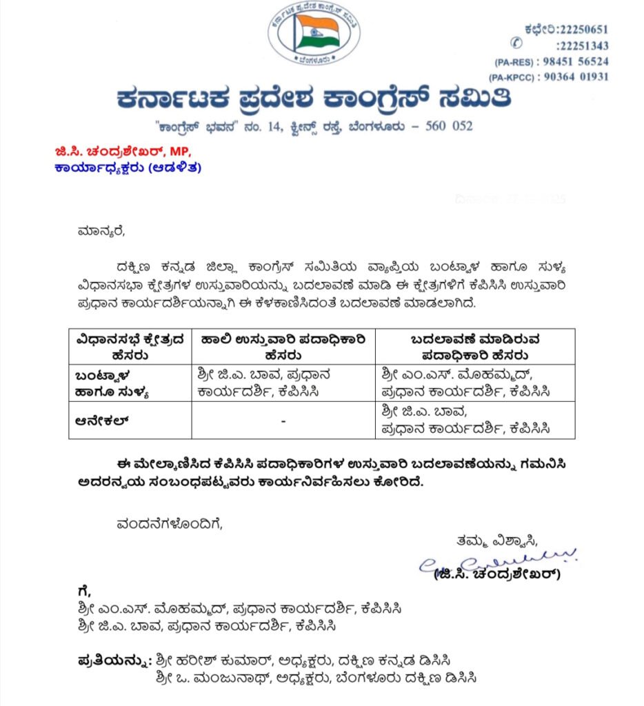 ಜಿ.ಎ. ಬಾವ ಅವರಿಗೆ ಆನೇಕಲ್ ಜವಾಬ್ದಾರಿ: ಈವರೆಗೆ ಬಂಟ್ವಾಳ ಮತ್ತು ಸುಳ್ಯ ಕ್ಷೇತ್ರಗಳ ಉಸ್ತುವಾರಿಯಾಗಿದ್ದ ಹಿರಿಯ ನಾಯಕ ಜಿ.ಎ. ಬಾವ ಅವರನ್ನು ಬೆಂಗಳೂರಿನ ಆನೇಕಲ್ ವಿಧಾನಸಭಾ ಕ್ಷೇತ್ರದ ಉಸ್ತುವಾರಿಯಾಗಿ ವರ್ಗಾಯಿಸಲಾಗಿದೆ. ಎರಡೂ ಕ್ಷೇತ್ರಗಳ ಸಂಘಟನಾತ್ಮಕ ದೃಷ್ಟಿಯಿಂದ ಕೆಪಿಸಿಸಿ ಈ ಬದಲಾವಣೆ ಮಾಡಿದೆ.