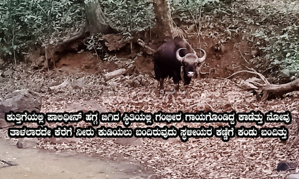ನಿನ್ನೆ(ಶುಕ್ರವಾರ)ಸಂಜೆ ಕುತ್ತಿಗೆಯಲ್ಲಿ ಪಾಲಿಥೀನ್ ಹಗ್ಗ ಬಿಗಿದ ಸ್ಥಿತಿಯಲ್ಲಿ ಗಂಭೀರ ಗಾಯಗೊಂಡಿದ್ದ ಕಾಡೆತ್ತು ನೋವು ತಾಳಲಾರದೇ ಕೆರೆಗೆ ನೀರು ಕುಡಿಯಲು ಬಂದಿರುವುದು ಸ್ಥಳೀಯರ ಕಣ್ಣಿಗೆ ಕಂಡು ಬಂದಿತ್ತು. ತಕ್ಷಣವೇ ಸ್ಥಳೀಯರು ಅರಣ್ಯ ಇಲಾಖೆಗೆ ಮಾಹಿತಿ ನೀಡಿದ್ದರು.