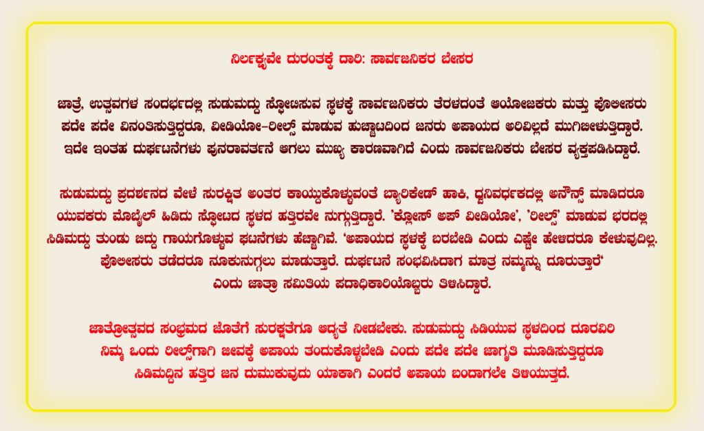 ದಿನಾಂಕ 17-04-2026 ರಂದು ರಾತ್ರಿ ಜಾತ್ರೆಯ ಗದ್ದೆಯಲ್ಲಿ ಸುಡುಮದ್ದು ಪ್ರದರ್ಶನ ನಡೆಯುತ್ತಿದ್ದಾಗ ಅವಾಂತರ ಸಂಭವಿಸಿದೆ. ದೂರದಲ್ಲಿ ನಿಂತು ಪ್ರದರ್ಶನ ವೀಕ್ಷಿಸುತ್ತಿದ್ದ ಕುಂದಾಪುರ ನಿವಾಸಿ ಸುಮಂತ್ ಶೆಟ್ಟಿ (20) ಹಾಗೂ ಅವರ ಸ್ನೇಹಿತರಾದ ಭರತ್, ಕೌಶಿಕ್, ಸೌಮ್ಯ, ದೀಪಕ್, ಯಶವಂತ್ ಮತ್ತು ಮೋಹನ್ ಎಂಬುವವರ ಮೇಲೆ ಸುಡುಮದ್ದಿನ ಬೆಂಕಿ ಬಿದ್ದಿದೆ. ಗಾಯಗೊಂಡವರನ್ನು ಚಿಕಿತ್ಸೆಗಾಗಿ ಮಂಗಳೂರಿನ ಆಸ್ಪತ್ರೆಗೆ ದಾಖಲಿಸಲಾಗಿದೆ. ಸುಡುಮದ್ದು ನಿರ್ವಹಣೆ ಮಾಡುವವರು ಹಾಗೂ ದೇವಸ್ಥಾನದ ವ್ಯವಸ್ಥಾಪನಾ ಸಮಿತಿಯವರು ಅಗತ್ಯ ಮುನ್ನೆಚ್ಚರಿಕಾ ಕ್ರಮಗಳನ್ನು ಕೈಗೊಳ್ಳದೆ ನಿರ್ಲಕ್ಷ್ಯ ವಹಿಸಿದ್ದೇ ಈ ಘಟನೆಗೆ ಕಾರಣ ಎಂದು ಸುಮಂತ್ ಶೆಟ್ಟಿ ನೀಡಿದ ದೂರಿನಂತೆ ಪುತ್ತೂರು ನಗರ ಠಾಣೆಯಲ್ಲಿ ಅ.ಕ್ರ: 45/2026 ಕಲಂ: 288, 125(a), 3(5) ಬಿಎನ್ಎಸ್ 2023 ರಂತೆ ಪ್ರಕರಣ ದಾಖಲಾಗಿದೆ.
