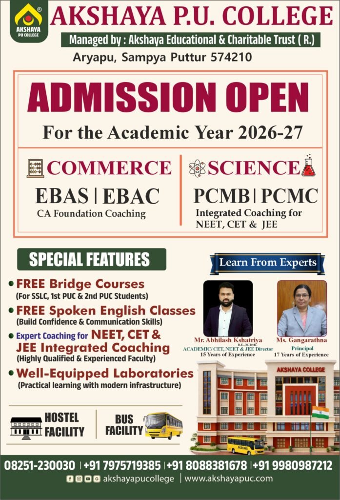 Bantawala2 months agoವಿಟ್ಲ ಮೈತ್ರೇಯಿ ಗುರುಕುಲದ ವಿದ್ಯಾರ್ಥಿನಿ ವೈಗ ಲಕ್ಷ್ಮಿ(15) ಆತ್ಮಹತ್ಯೆ ? ; ಫೆ. 22ರಂದು ಗುರುಕುಲದಿಂದ ನಾಪತ್ತೆಯಾದ 10ನೇ ತರಗತಿ ವಿದ್ಯಾರ್ಥಿನಿ